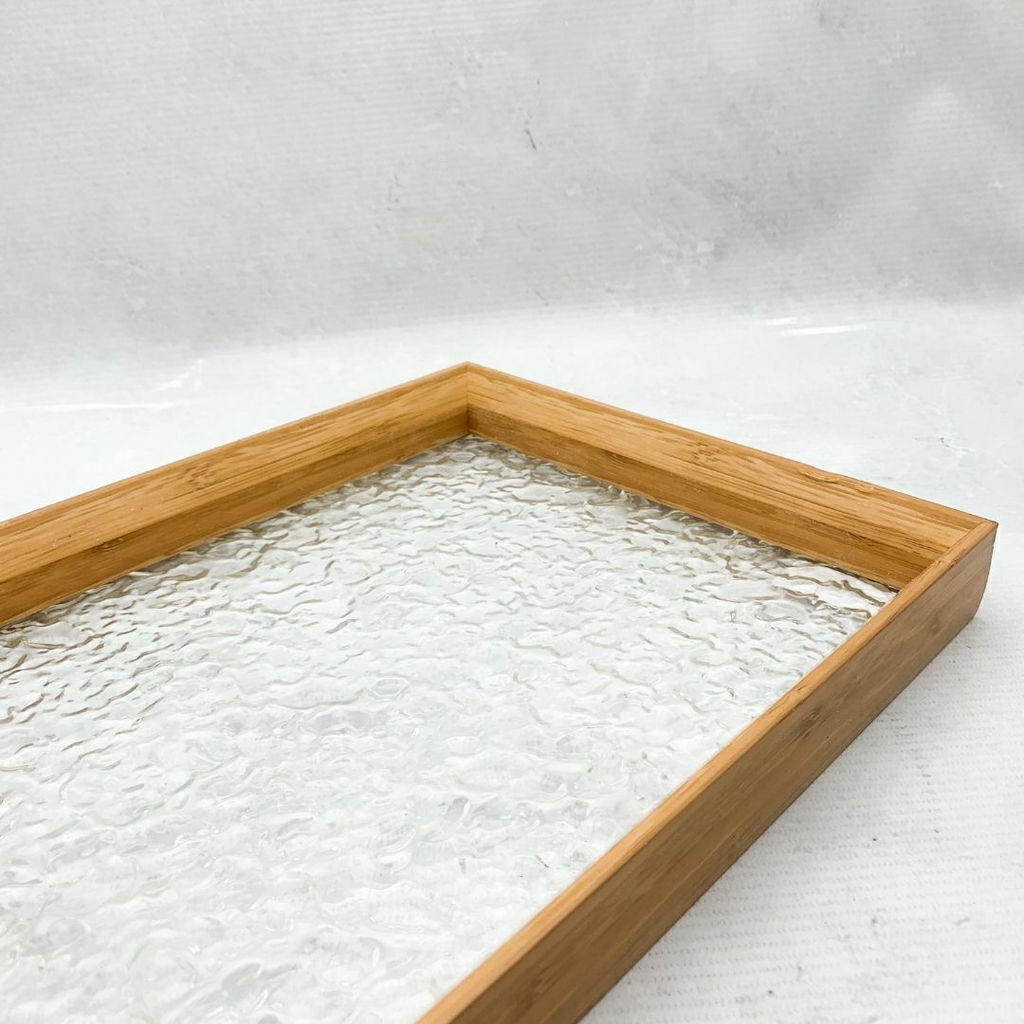 Bandeja de diseño que combina bambu aportando un toque natural, cálido y sostenible. Es un material ligero, resistente y con una estética agradable, con acrilico, un tipo de plástico transparente y brillante, similar al vidrio pero más ligero y resistente a los golpes. Permite ver el contenido de la bandeja y es fácil de limpiar. La combinación de la calidez del bambú con la transparencia y modernidad del acrílico crea un diseño atractivo y versátil que puede encajar en diferentes estilos de decoración. Pueden tener diversos usos: Para servir: Desayunos en la cama, aperitivos, bebidas, etc. El acrílico facilita la limpieza en caso de derrames. Organización: Para ordenar objetos en el baño (cosméticos, toallas pequeñas), en el escritorio (material de oficina), en la cocina (especias, utensilios pequeños). Decoración: Pueden utilizarse como base para exhibir elementos decorativos como velas, plantas pequeñas, figuras, etc. Almacenamiento: Para guardar pequeños objetos y mantenerlos a la vista.