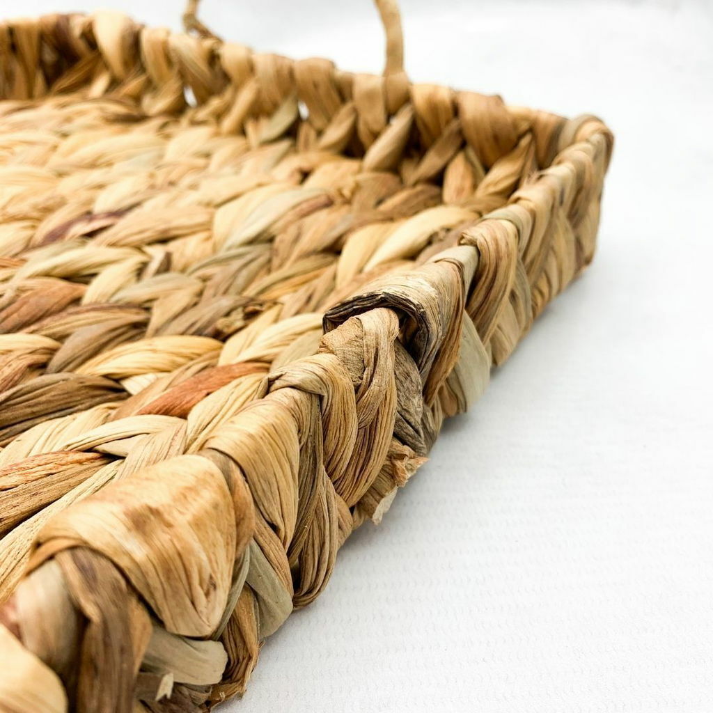 Esta bandeja cuadrada tejida con asas, en tonos naturales ,dos asas pequeñas en los lados, también hechas del mismo material tejido. Tips de uso: Como centro de mesa o elemento decorativo en estanterías. Para servir bebidas o frutas. Su estética la hace perfecta para combinar con la deco de todos los estilos desde minimalista hasta decos mas rusticas.