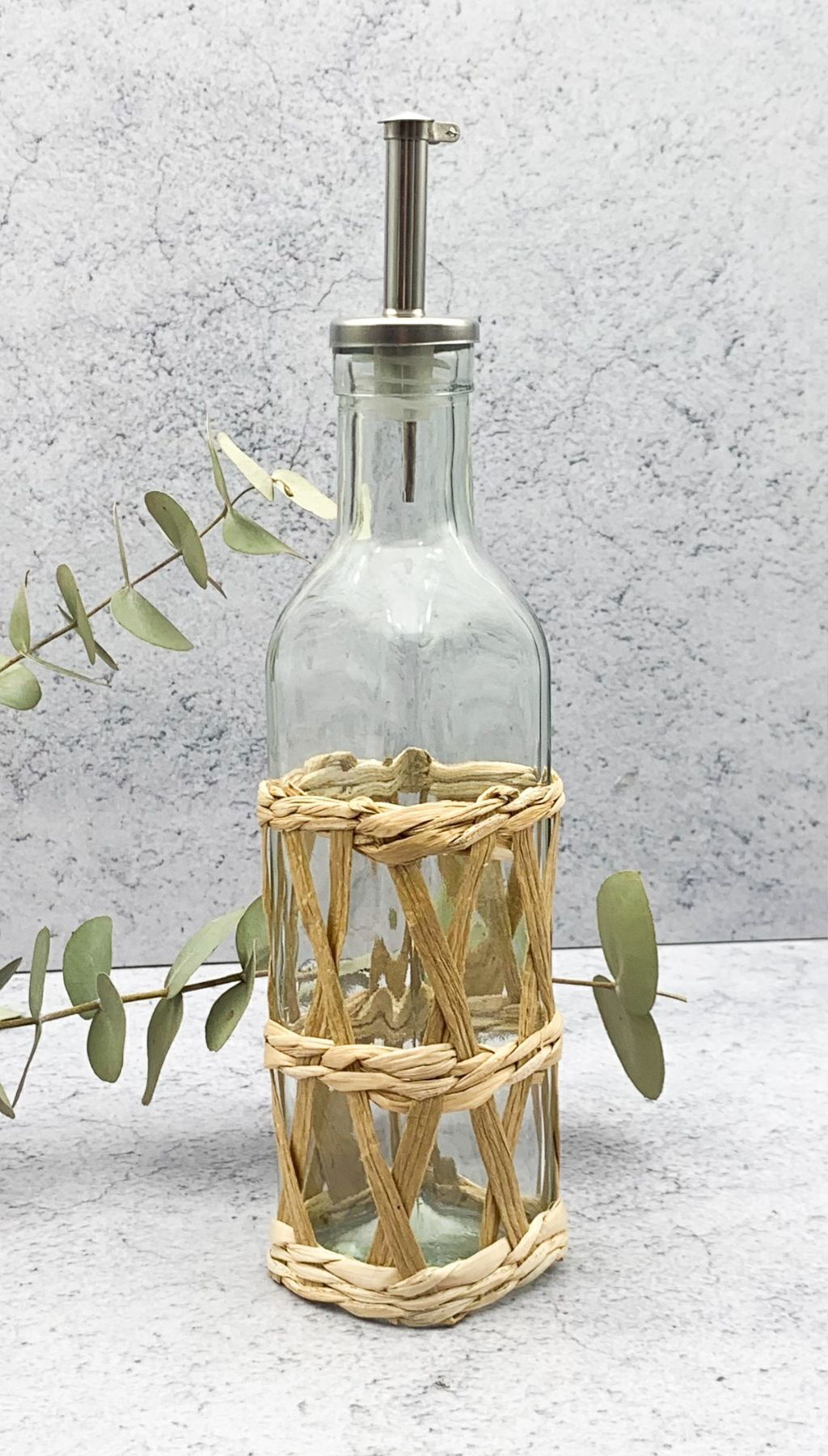 Este recipiente para aceite / vinagre con cuerpo de vidrio, cubierto de seagrass y con un pico vertedor, es una combinación de funcionalidad y estética rústica.Este elegante recipiente es la solución perfecta para servir y dosificar de forma controlada y con estilo. Combina un diseño práctico y un toque natural que realza la decoración de cualquier cocina o mesa.