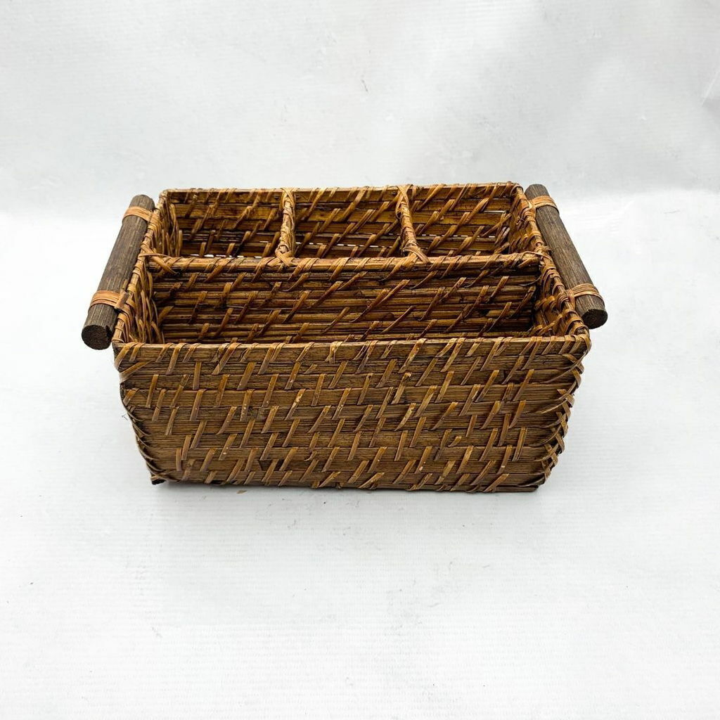 e trata de una cesta rectangular tejida en un tono marrón antiguo, dividida en cuatro compartimentos internos de diferentes tamaños. Por su diseño con múltiples compartimentos, este tipo de canasto es ideal para organizar objetos de cocina. Úsalo para tener a mano todo eso que necesitas para cocinar ordenado. Su estética lo hace especial para combinar con la deco tanto de estilos rústicos como mas minimalistas. Medida 26X15.5X12 CM