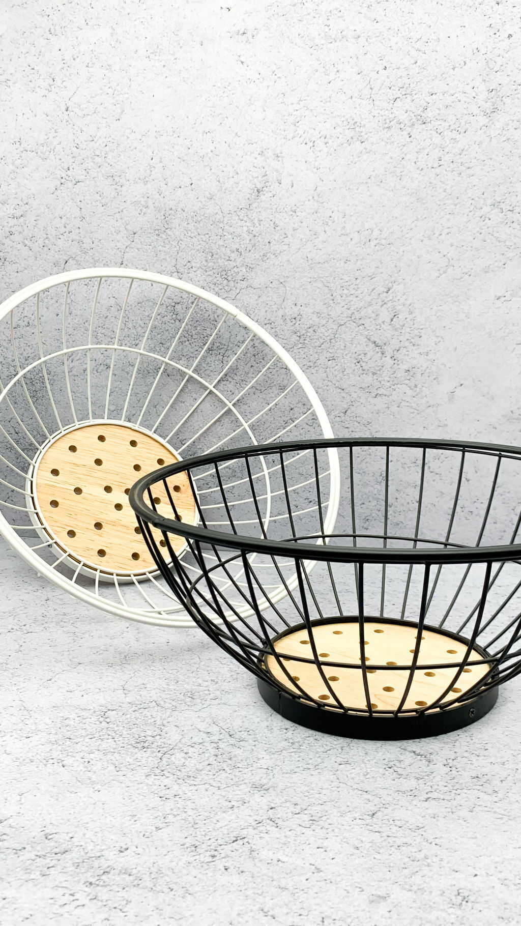 Esta frutera de metal con base de madera es un elemento decorativo y funcional que combina la resistencia y modernidad del metal con la calidez y la estética natural de la madera.Su uso principal, permitiendo que las frutas se exhiban de forma atractiva y se mantengan ventiladas, lo que ayuda a su conservación. También vacía o con elementos decorativos como esferas, potpourri, o pequeñas plantas.