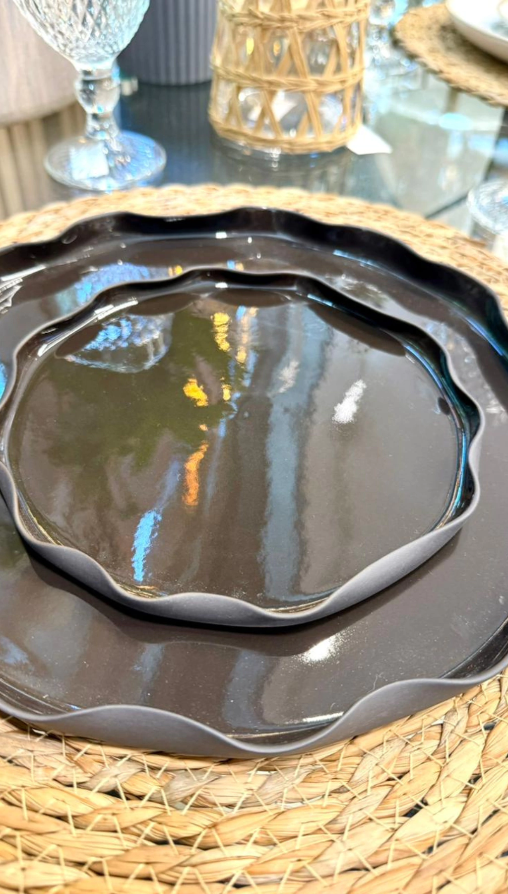 Este plato con bordes ondulados es un diseño de vajilla muy elegante.Este tipo de borde le da un toque clásico, vintage o romántico a la mesa. Este tipo de plato no es solo una pieza funcional, sino un detalle de diseño que eleva la presentación de la mesa. El diseño rompe con la rigidez geométrica del círculo perfecto, añadiendo suavidad y dinamismo visual.