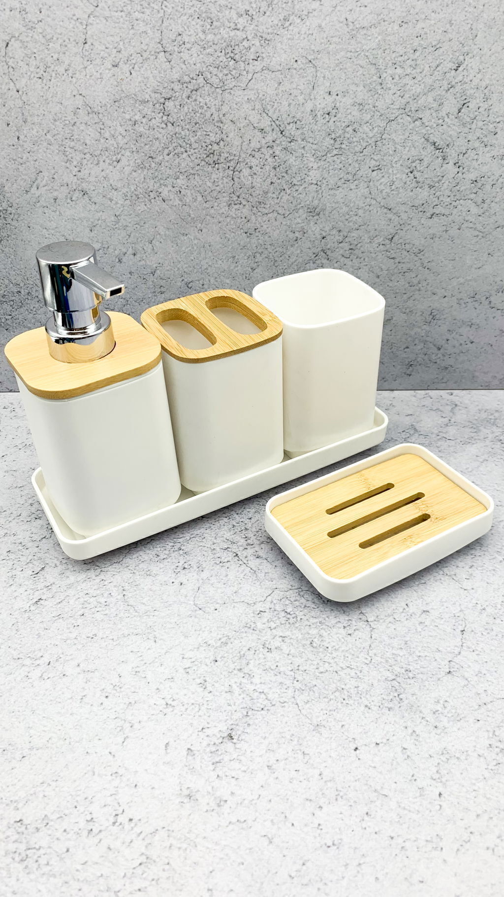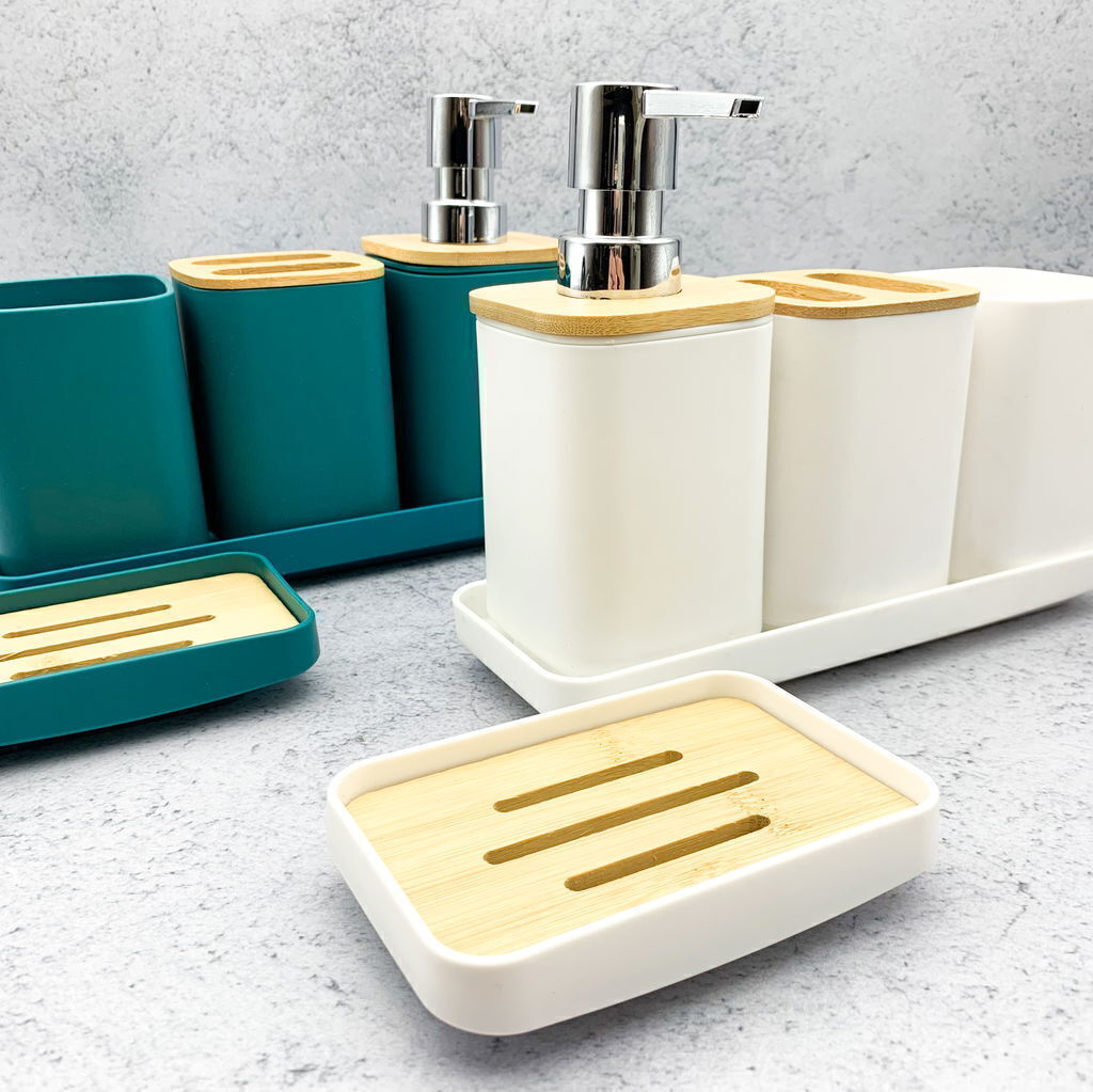 Este set de baño de plástico de color con bandeja de apoyo es una solución práctica y económica para organizar los accesorios esenciales de tu lavabo. Este tipo de set combina la funcionalidad de los recipientes individuales con la organización que ofrece una bandeja, manteniendo todo en su lugar y aportando un toque de color a la decoración de tu baño. El material es ligero, resistente a las caídas y muy fácil de limpiar. La bandeja de apoyo es especialmente útil para recoger el goteo del jabón o del agua, protegiendo la superficie del lavabo y facilitando la limpieza general.