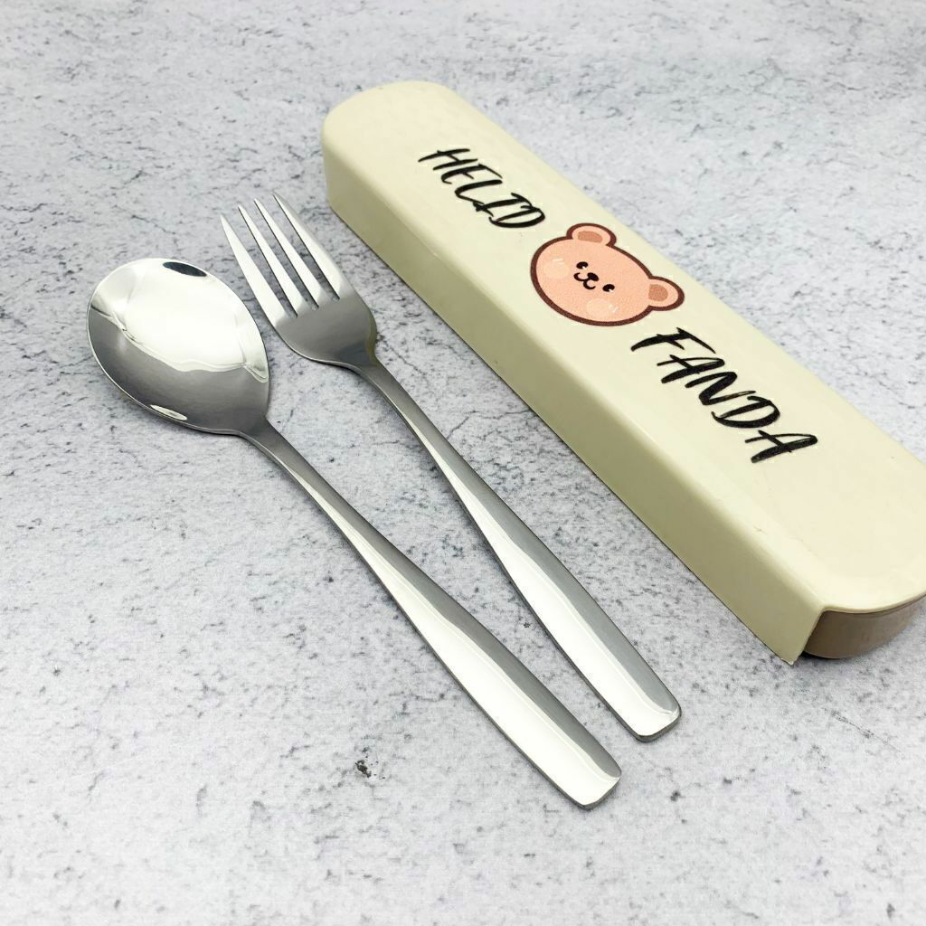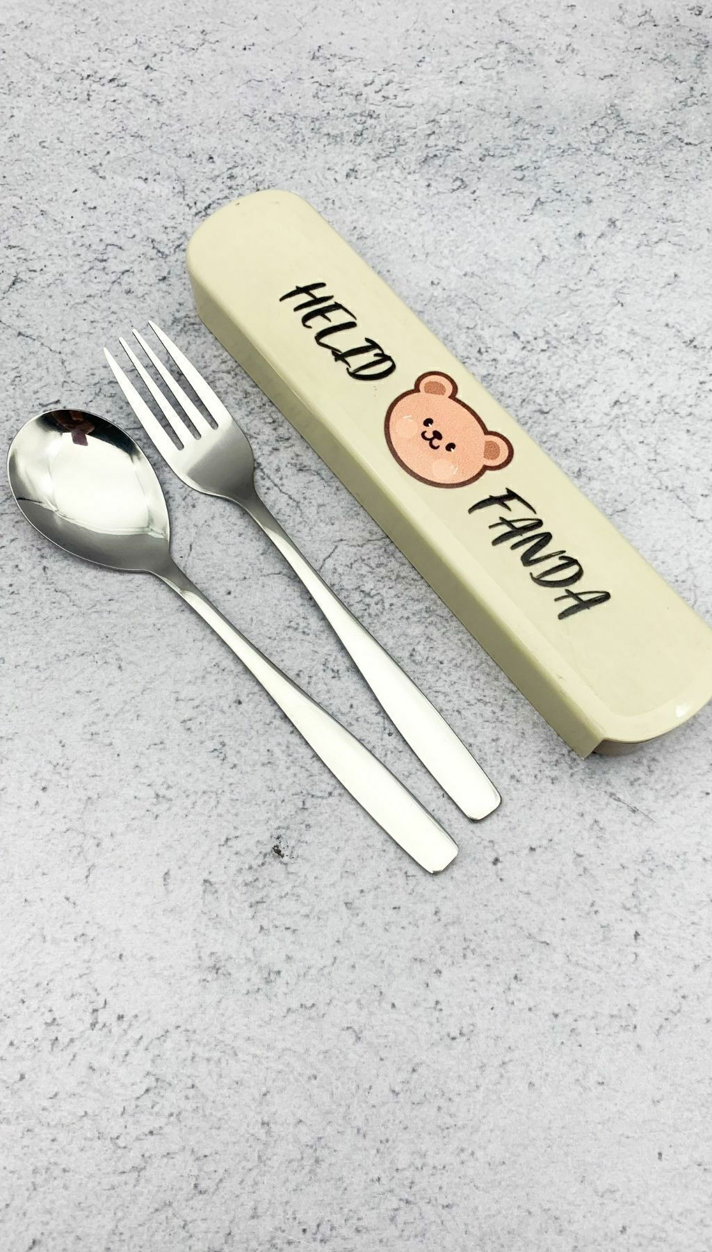 Este set de cubiertos portátiles que incluye una cuchara y un tenedor. Ambos utensilios son de acero inoxidable con un acabado pulido y brillante. Para transportarlos, el set viene con un estuche de plástico rígido de color crema . Este tipo de kit es ideal para que los niños lleven a la escuela o para usarse durante un viaje, ya que es una alternativa higiénica y sostenible a los cubiertos desechables.