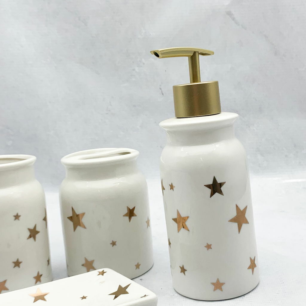 Un set de baño en cerámica de 4 piezas es una excelente opción para darle un toque elegante y clásico a tu baño. El set de baño gold incluye un dispensador de jabón líquido, una jabonera, un vaso para cepillos de dientes y un vaso para enjuague bucal. El diseño original en una gama de colores clásicos lo hacen ideal para darle un toque de originalidad y a su vez poder combinarlo con los otros elementos del baño.